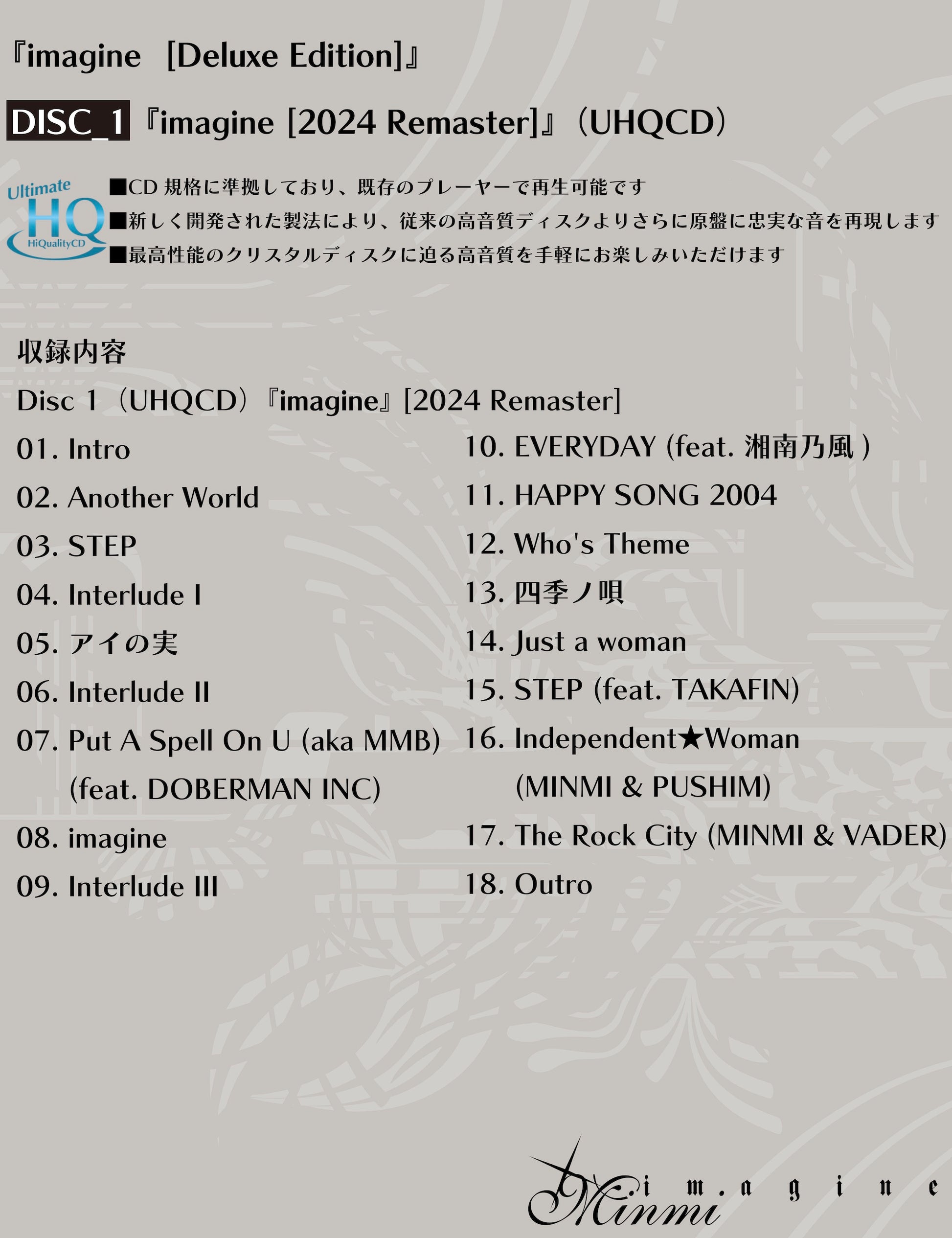 全曲最新デジタルリマスタリングを施し、アルバム本編はハイリーダーUHQCD化。(ライブ)もBlu-ray化して特別に付属。 ライナーにはMINMI最新ロングインタビューも掲載した超豪華盤!!